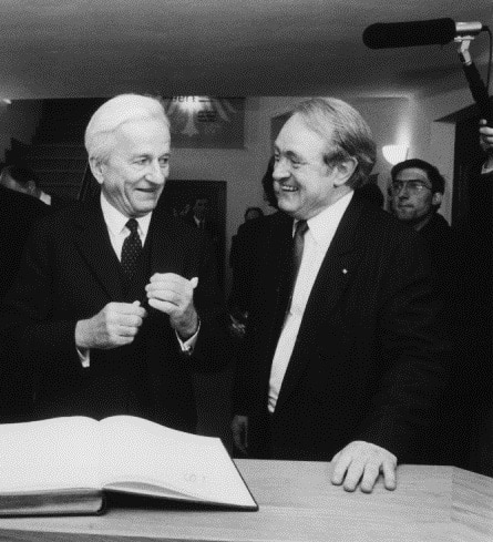 - Bundespräsident Richard von Weizsäcker mit dem Kuratoriumsvorsitzenden der Stiftung Johannes Rau, 1989 – SRFEG
