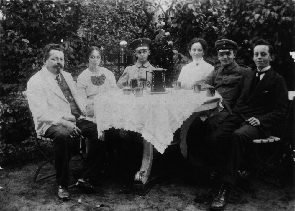 - Familie Ebert am Tisch in einem Garten im September 1916 mit den Söhnen Heinrich und Friedrich jr. in Soldatenuniformen – SRFEG