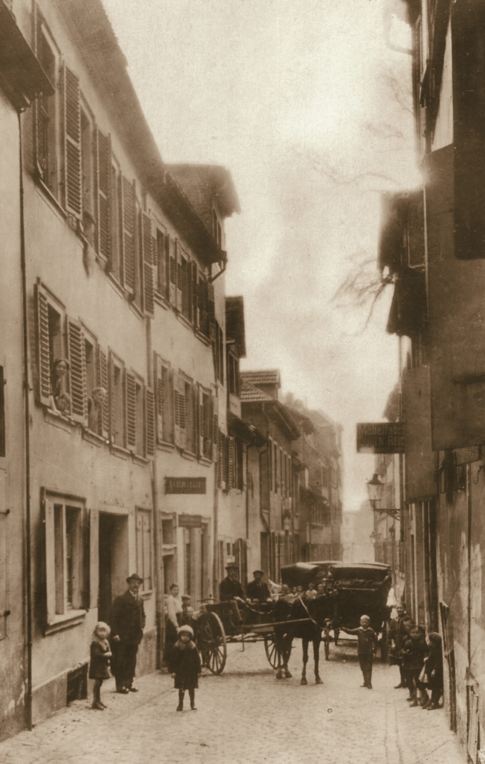 - Blick in die Pfaffengasse mit Kutschen, Kindern und Erwachsenen, 1919 – SRFEG